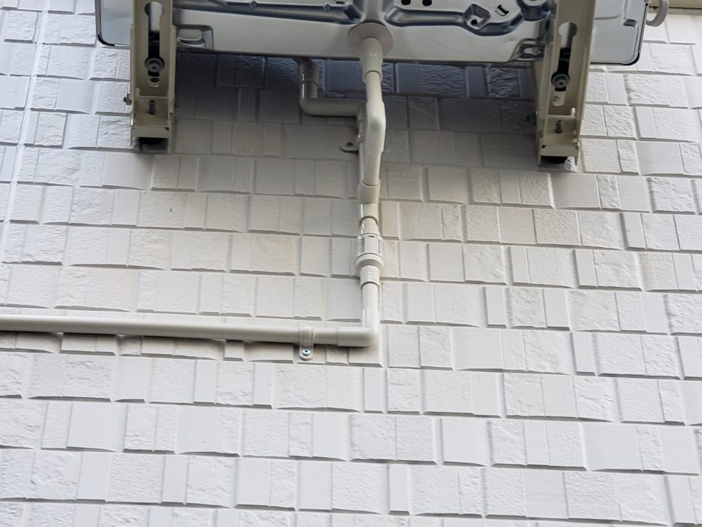 室内機からのドレン配管と室外機からのドレン配管を合流させて1本のパイプにしています。