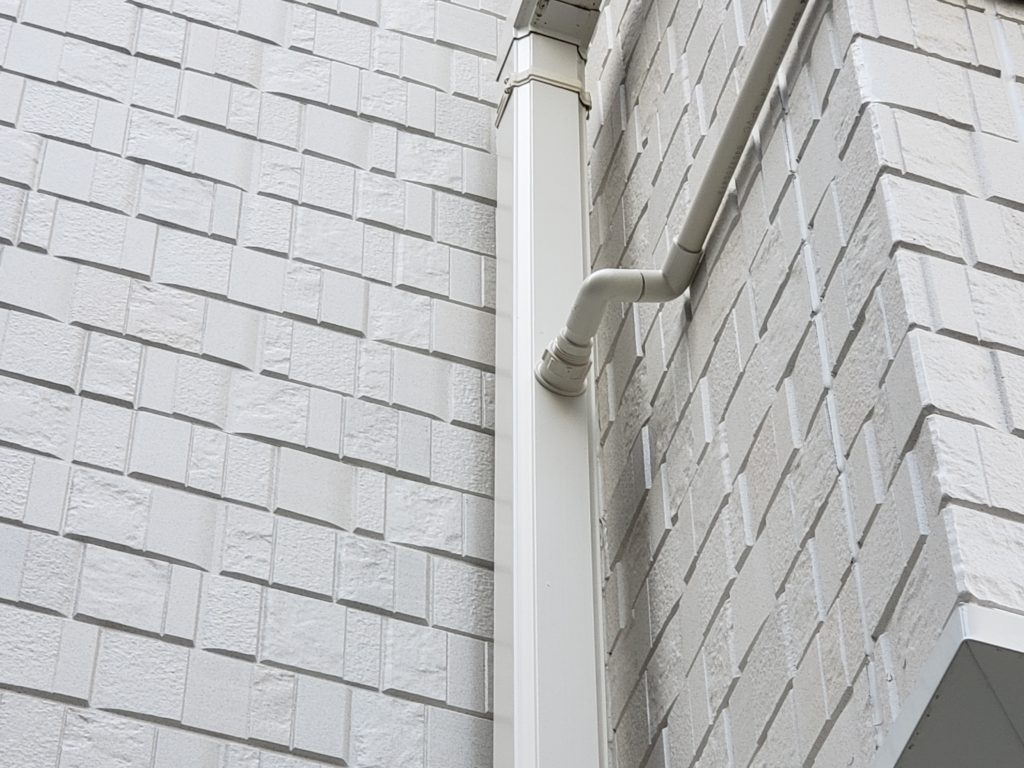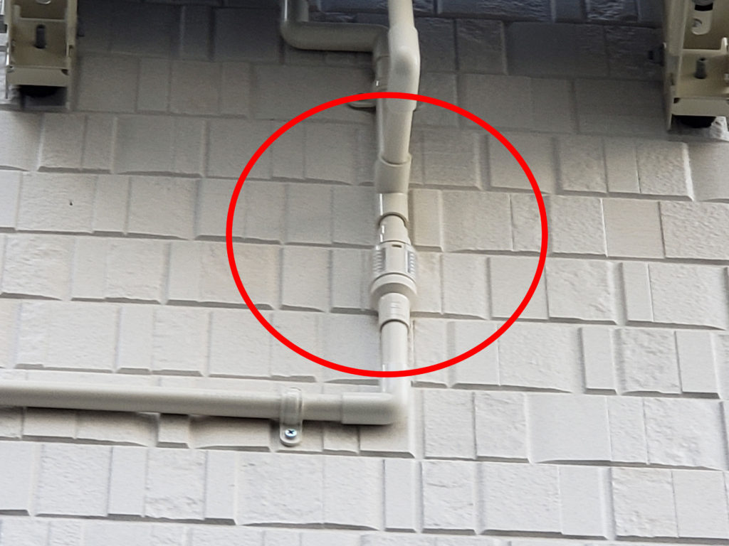 良くあるのが、雨樋に穴を開けてそのままパイプを差し込んである仕様ですが、雨樋と連結をする専用の部材があるので、そちらを使用しています。