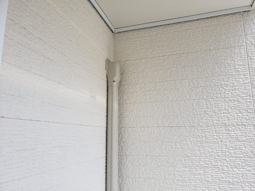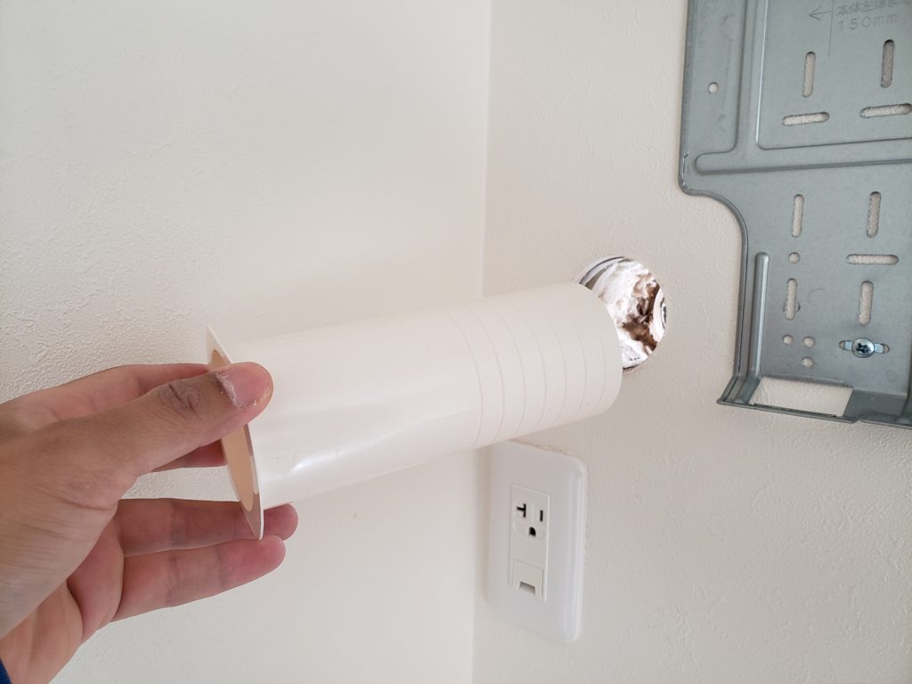 外から見ると、スリーブと外壁の間に隙間が出来ています。通常であれば、パテを使用し隙間を埋めていきます。