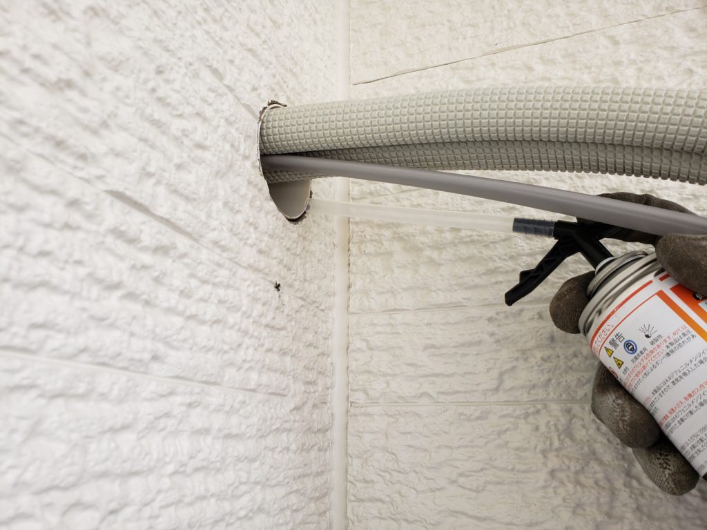 今回のお客様からの要望で、気密性を高める為、隙間を徹底的に塞いでほしいとの事で、発砲ウレタンを注入し隙間を埋めていきます。