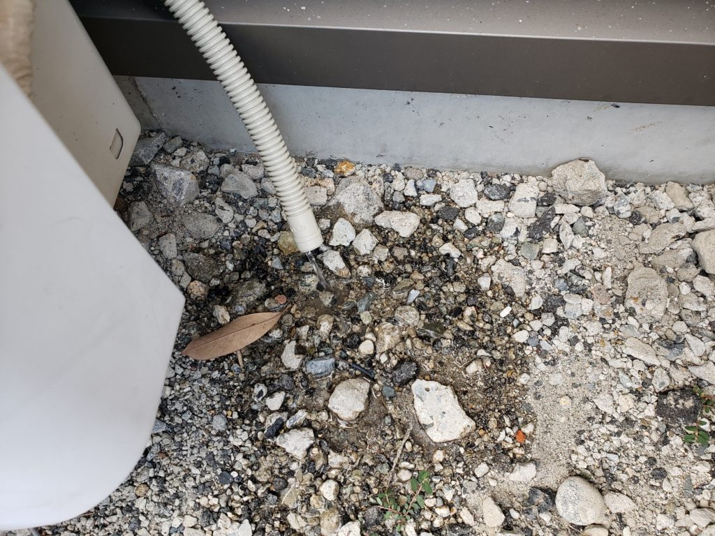 一度天井裏へ上げる為、そのままでは水が外に排出されないので、ポンプを取付て強制的に排出をしています。