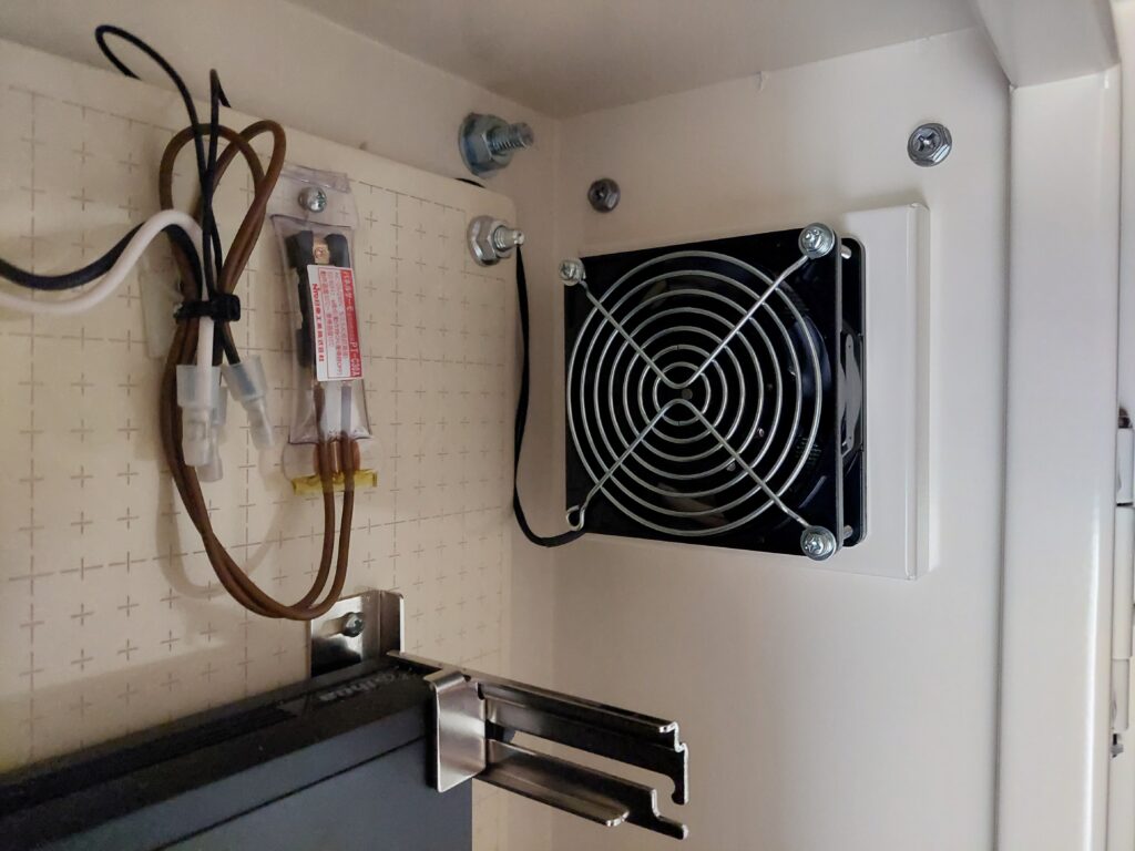 屋外設置の為、熱対策でキャビネット内にはファンを搭載しています。