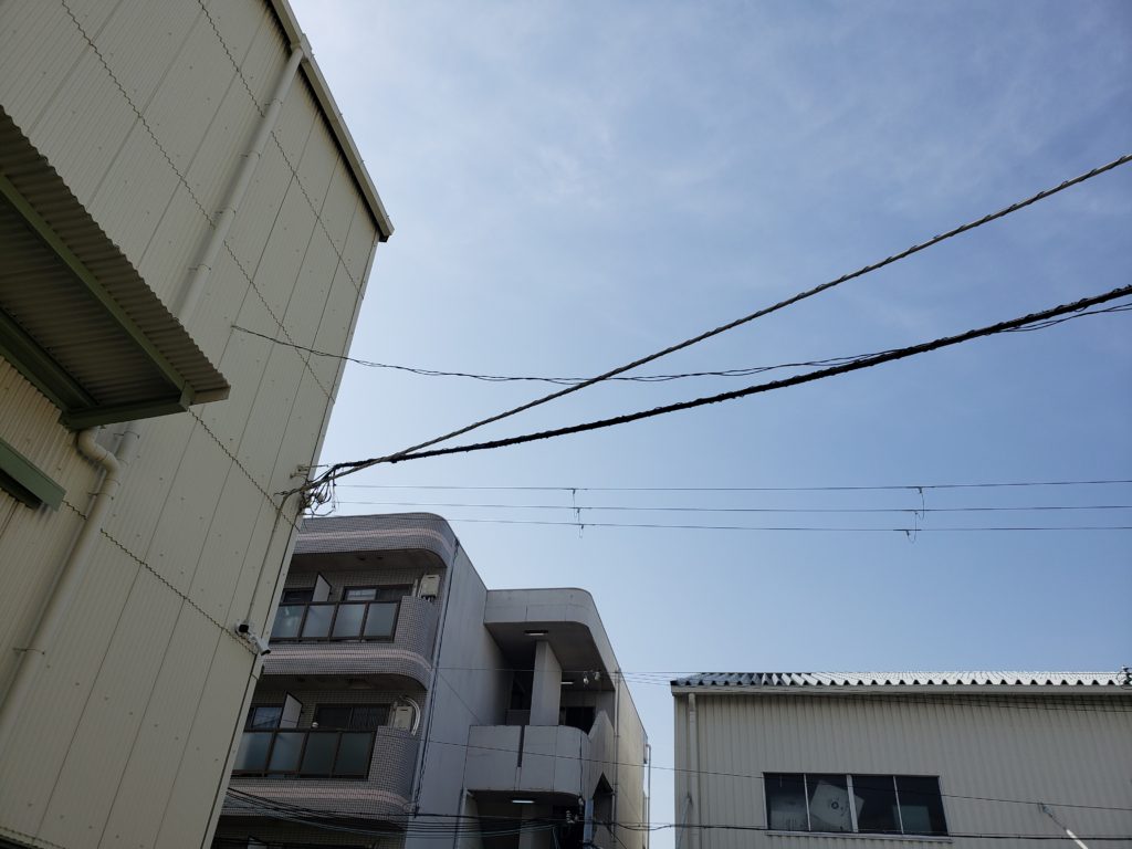 事務所と工場が離れている為、工場への配線は、架空配線にて横断しています。