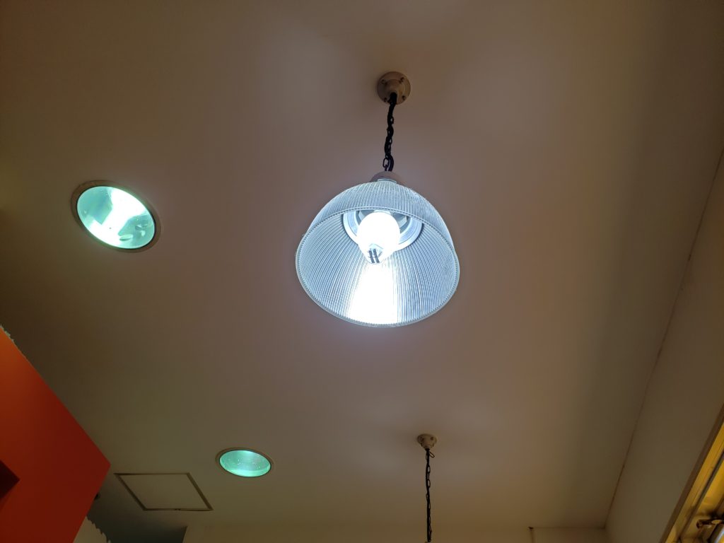 現在は、水銀ランプを使用していますが、天井の高い部分に設置されている為、球替えが大変なのと球の寿命が短いや電気代が高い為、LEDへの変更です。