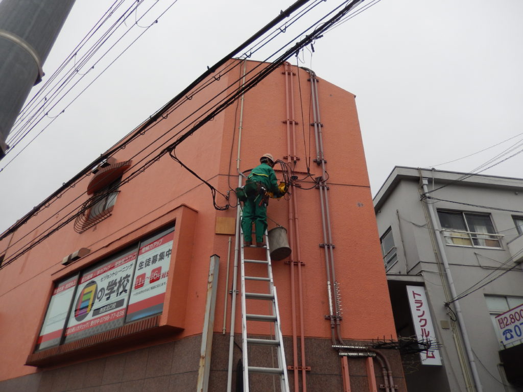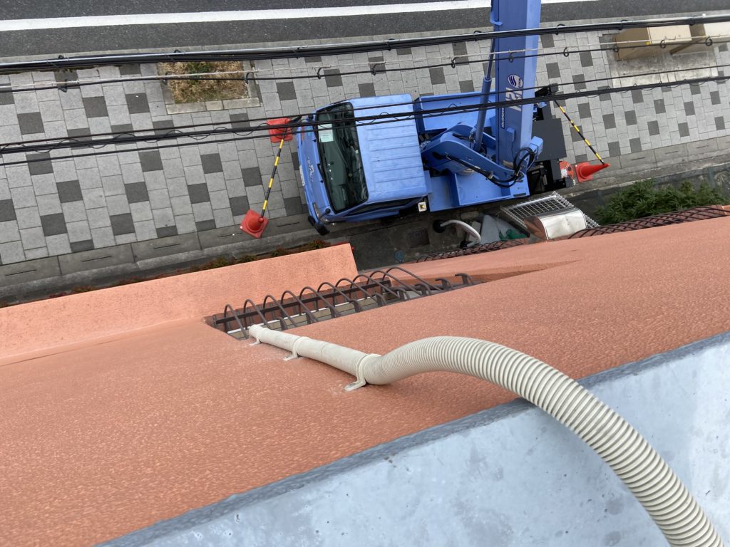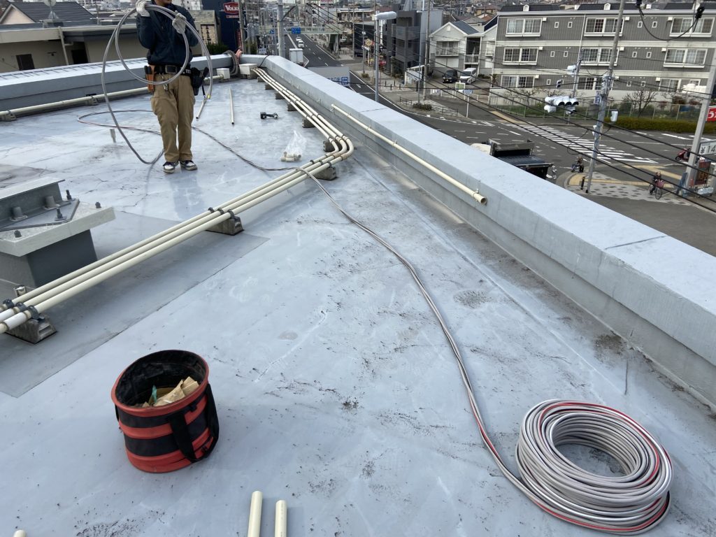 建物を横断して配線を敷設する必要があるため、今回は、建物の屋上に配線工事を行いました。