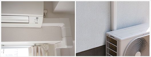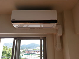 戸建住宅の場合は、室内機の背面に穴を開ける為、室内には配管が露出しない事が多く、マンションの場合は、配管穴まで距離があり、室内の露出部分が長くなります。