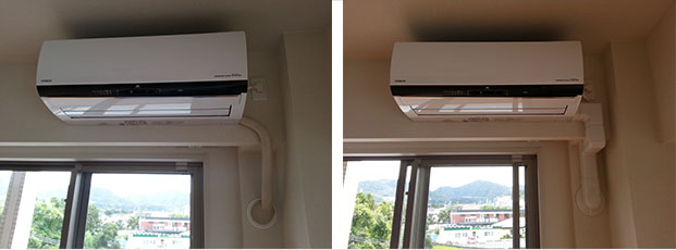 特にマンションの場合は、室内機から配管穴まで室内を露出をする部分が長く、室内化粧カバーにより美観が大きく変わります。